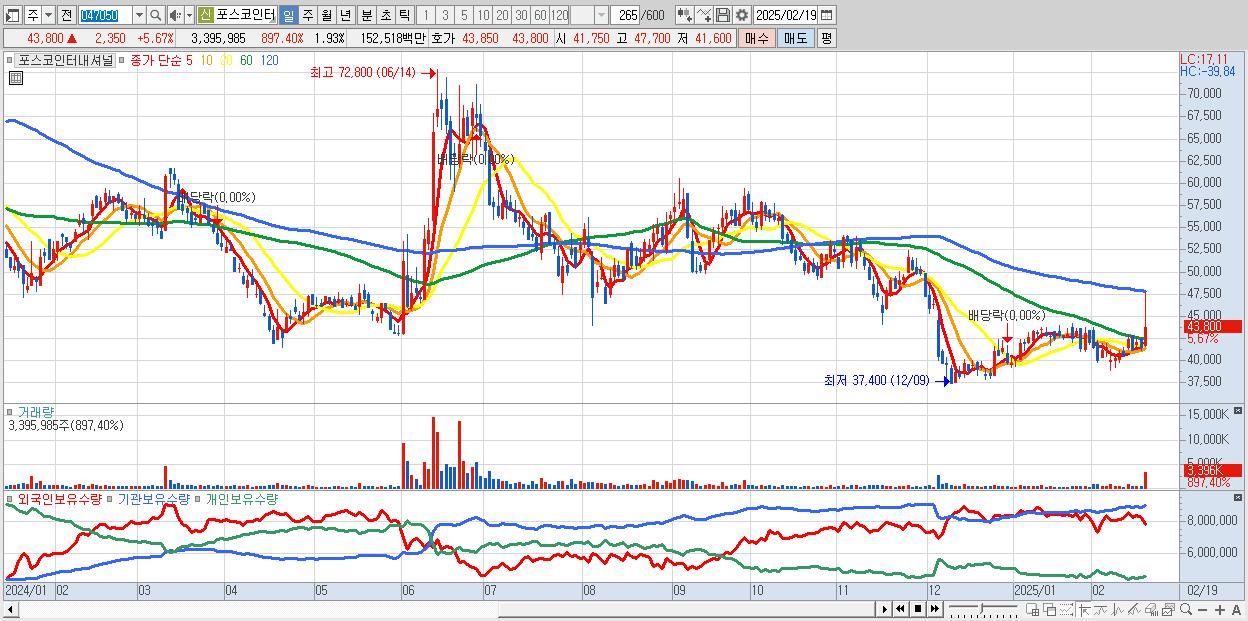 - 포스코인터내셔널 (43,800원 ▲ 5.67% , 시총: 77,054억, 거래량: 3,395,985, 거래대금:1,525억)