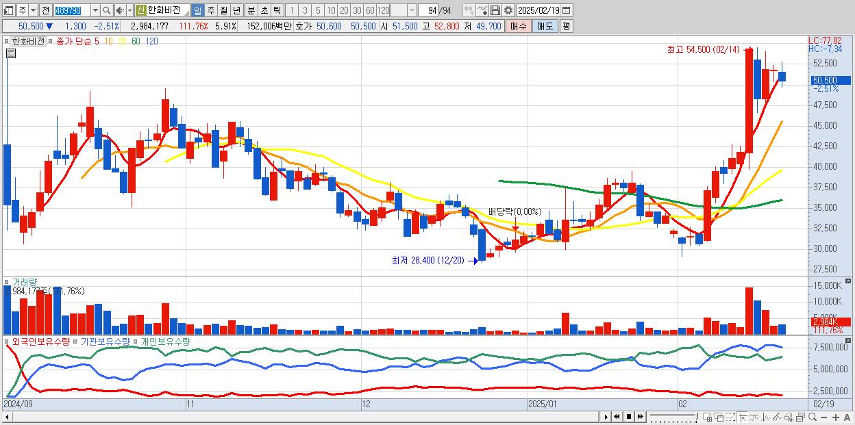 - 한화비전 (50,500원 ▼ -2.51% , 시총: 25,497억, 거래량: 2,984,177, 거래대금:1,520억)
