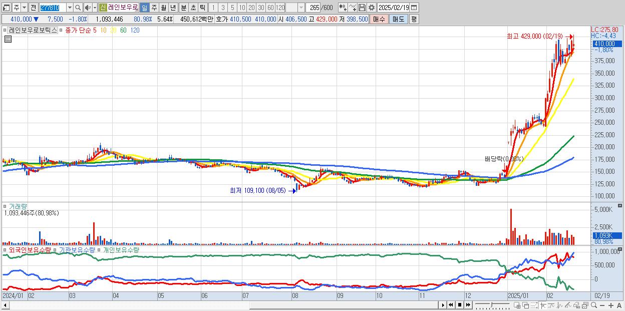 - 레인보우로보틱스 (410,000원 ▼ -1.8% , 시총: 79,539억, 거래량: 1,093,446, 거래대금:4,506억)