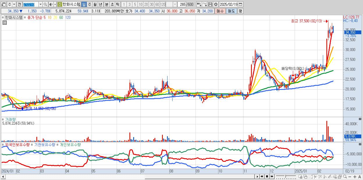 - 한화시스템 (34,350원 ▼ -3.78% , 시총: 64,894억, 거래량: 5,874,224, 거래대금:2,039억)