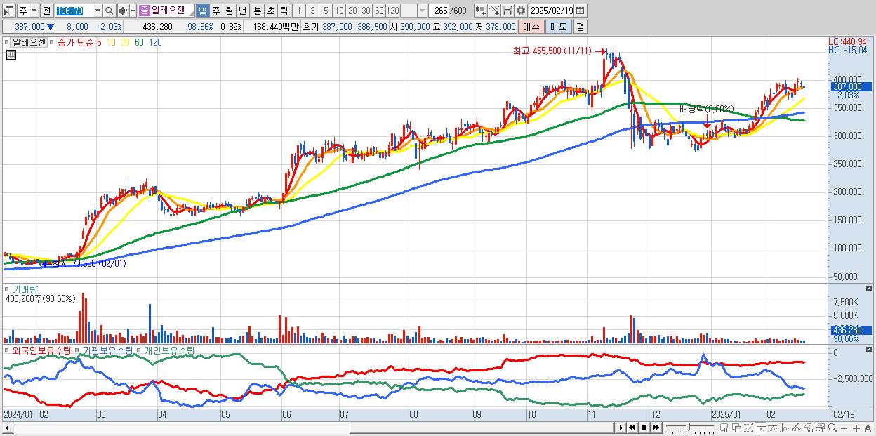 - 알테오젠 (387,000원 ▼ -2.03% , 시총: 206,344억, 거래량: 436,280, 거래대금:1,684억)