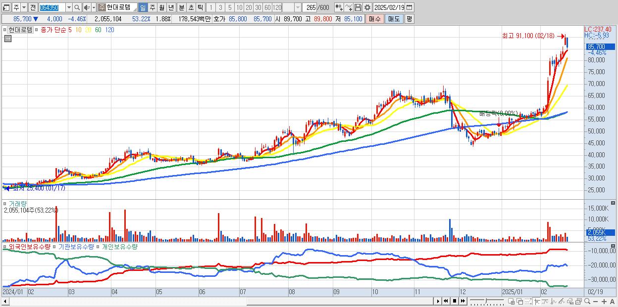 - 현대로템 (85,700원 ▼ -4.46% , 시총: 93,535억, 거래량: 2,055,104, 거래대금:1,785억)