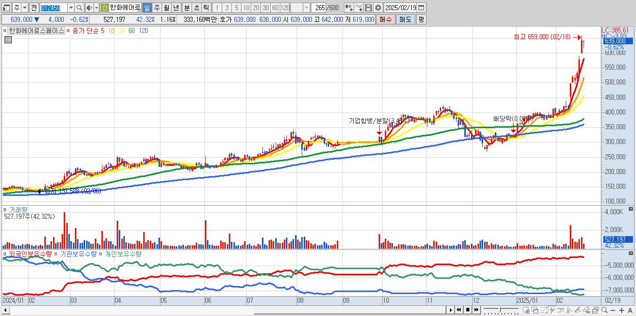 - 한화에어로스페이스 (639,000원 ▼ -0.62% , 시총: 291,264억, 거래량: 527,197, 거래대금:3,332억)