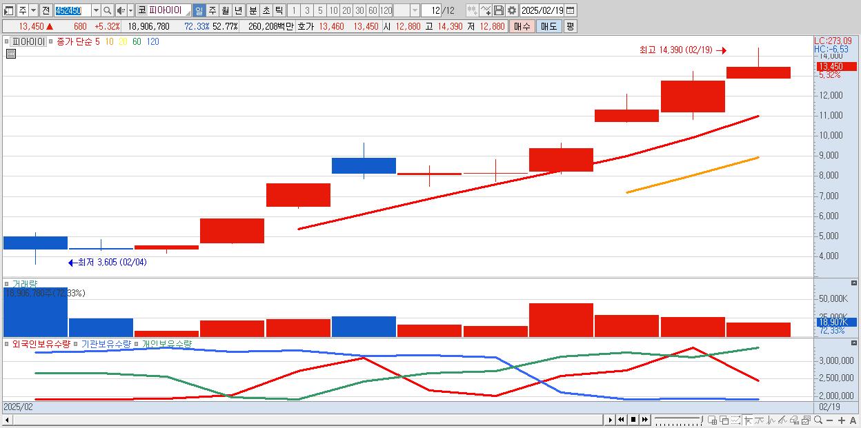 - 피아이이 (13,450원 ▲ 5.32% , 시총: 4,819억, 거래량: 18,906,780, 거래대금:2,602억)