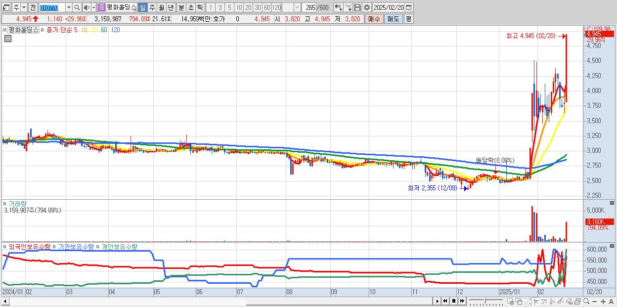 - 평화홀딩스 (4,945원 ▲ 29.96% , 시총: 723억, 거래량: 3,159,987, 거래대금:150억)
