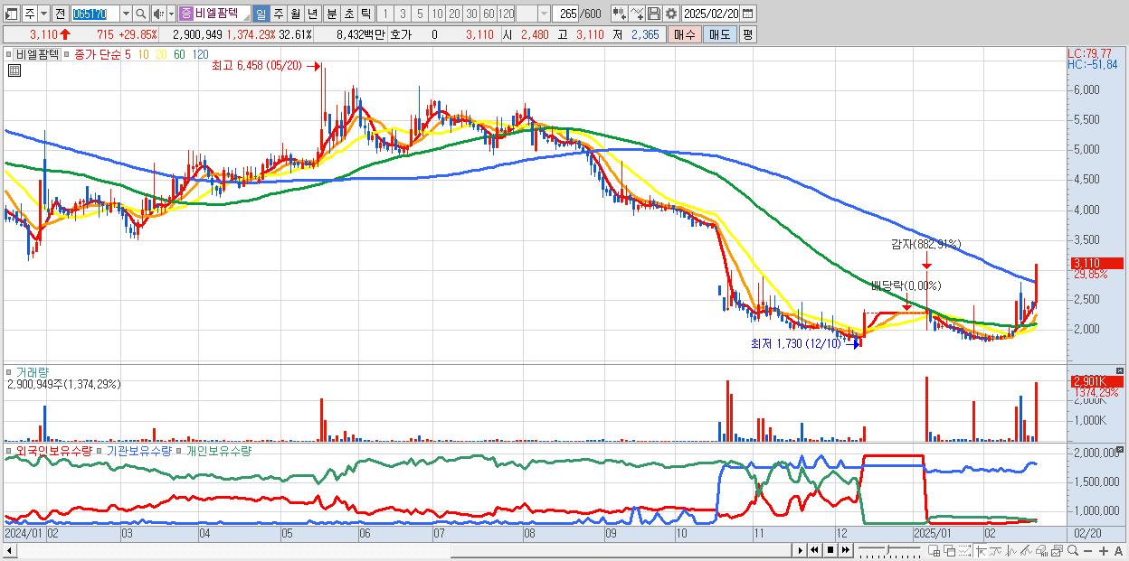 - 비엘팜텍 (3,110원 ▲ 29.85% , 시총: 277억, 거래량: 2,900,949, 거래대금:84억)