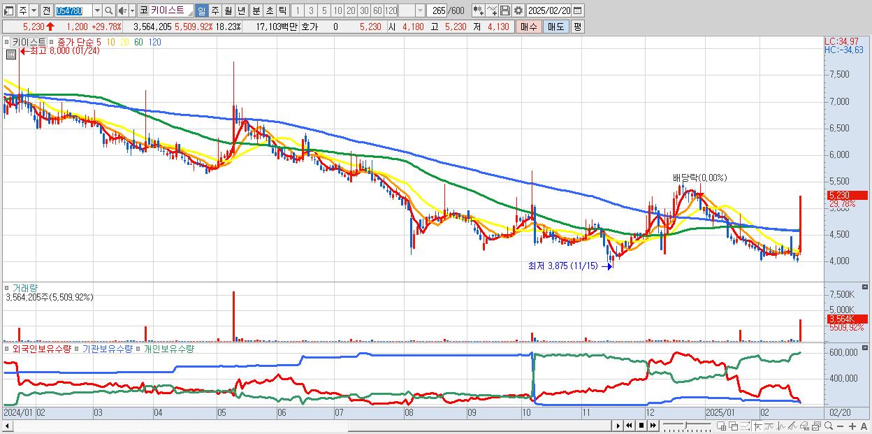 - 키이스트 (5,230원 ▲ 29.78% , 시총: 1,022억, 거래량: 3,564,205, 거래대금:171억)