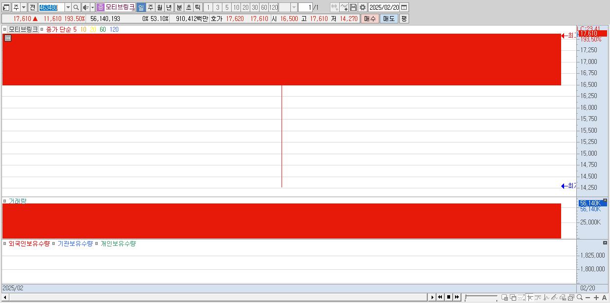 - 모티브링크 (17,610원 ▲ 193.5% , 시총: 2,182억, 거래량: 56,140,193, 거래대금:9,104억)