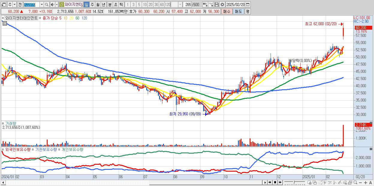 - 와이지엔터테인먼트 (60,200원 ▲ 13.16% , 시총: 11,252억, 거래량: 2,713,656, 거래대금:1,619억)