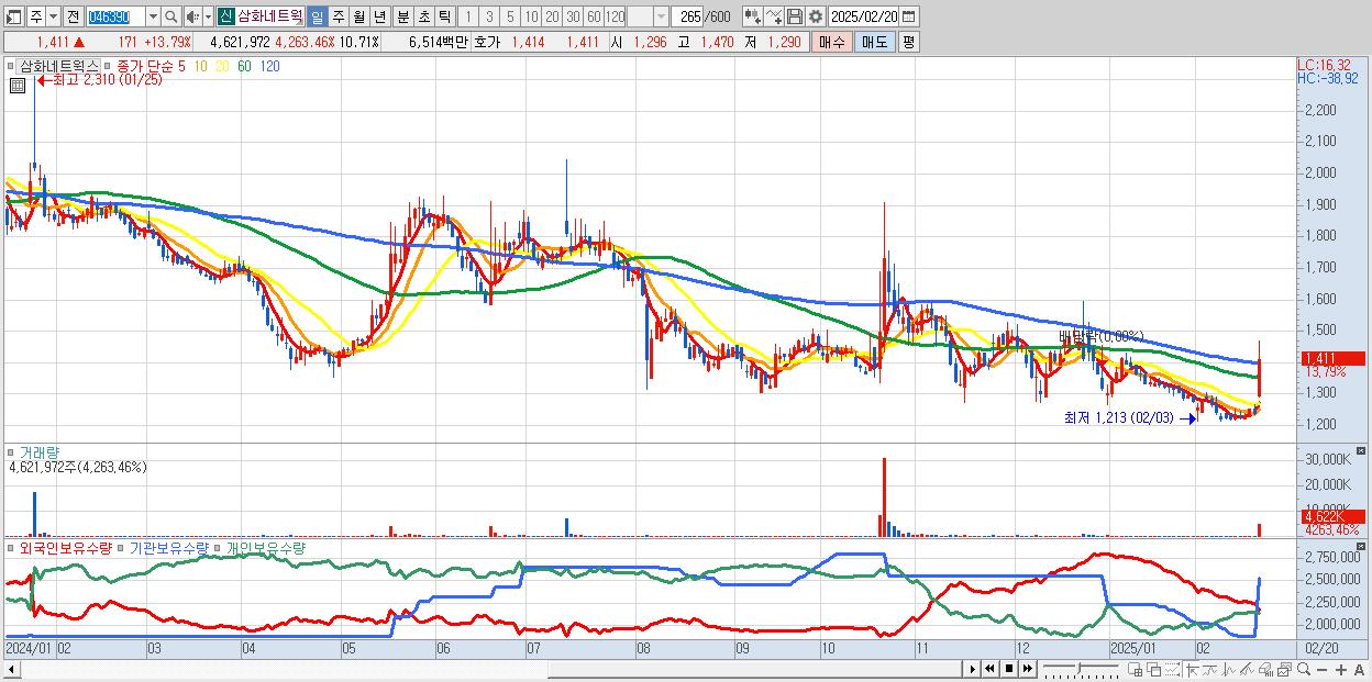 - 삼화네트웍스 (1,411원 ▲ 13.79% , 시총: 609억, 거래량: 4,621,972, 거래대금:65억)
