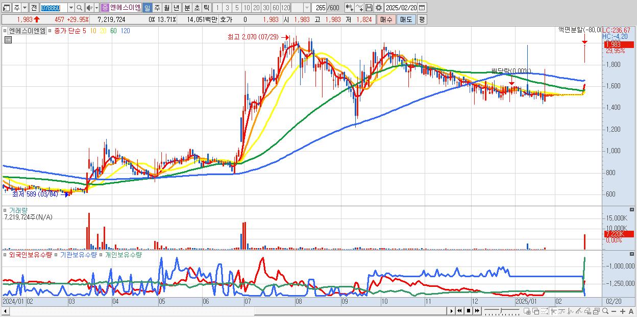 - 엔에스이엔엠 (1,983원 ▲ 29.95% , 시총: 1,044억, 거래량: 7,219,724, 거래대금:141억)