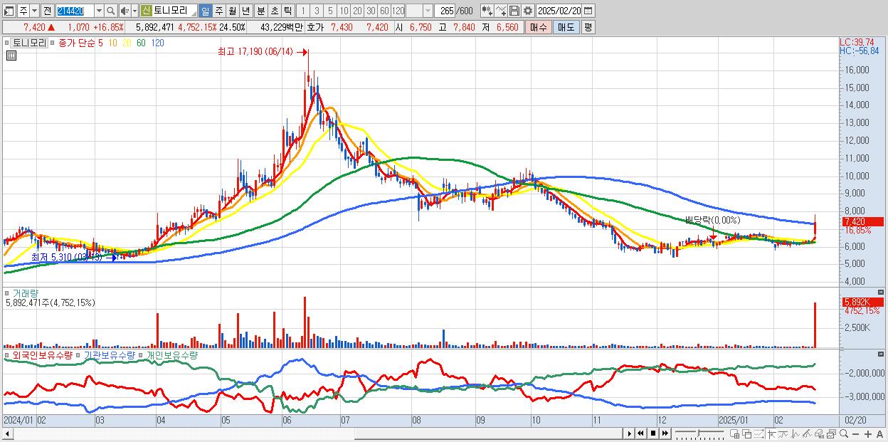 - 토니모리 (7,420원 ▲ 16.85% , 시총: 1,785억, 거래량: 5,892,471, 거래대금:432억)