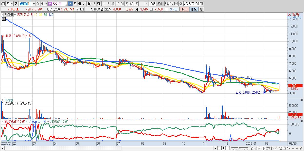 - 자이글 (4,000원 ▲ 13.96% , 시총: 541억, 거래량: 1,012,286, 거래대금:42억)