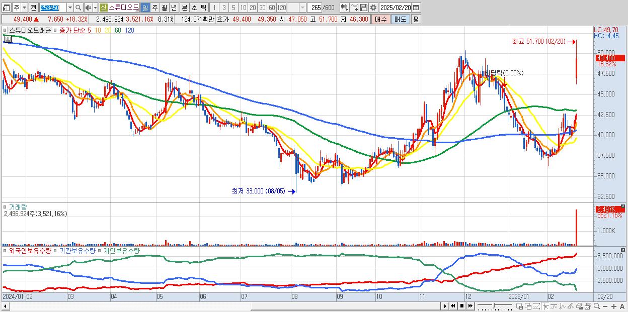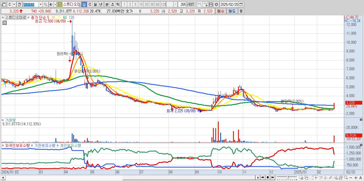 - 스튜디오미르 (3,220원 ▲ 29.84% , 시총: 1,053억, 거래량: 9,311,877, 거래대금:270억)