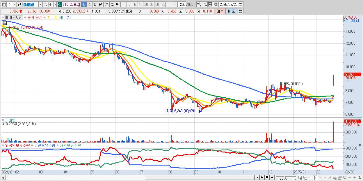 - 에이스토리 (9,360원 ▲ 30% , 시총: 893억, 거래량: 418,205, 거래대금:38억)