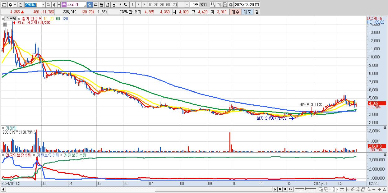 - 스코넥 (4,365원 ▲ 11.78% , 시총: 548억, 거래량: 236,019, 거래대금:10억)