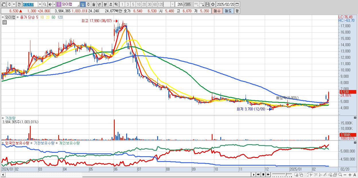 - 와이랩 (6,530원 ▲ 24.86% , 시총: 1,074억, 거래량: 3,984,365, 거래대금:247억)