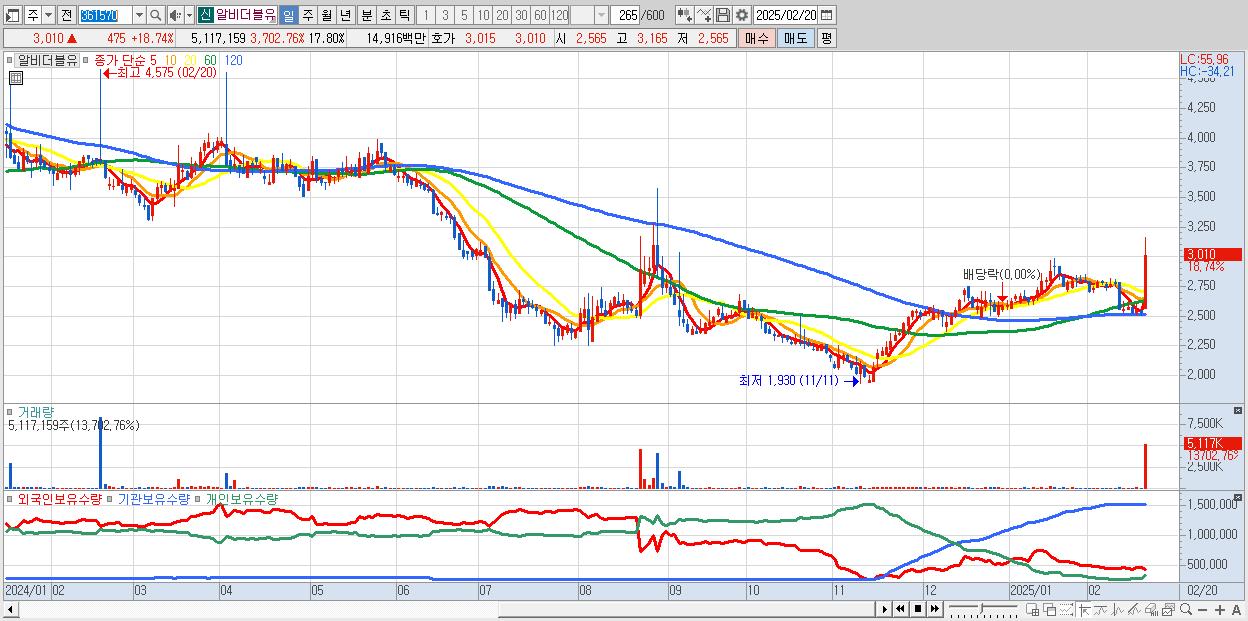 - 알비더블유 (3,010원 ▲ 18.74% , 시총: 865억, 거래량: 5,117,159, 거래대금:149억)