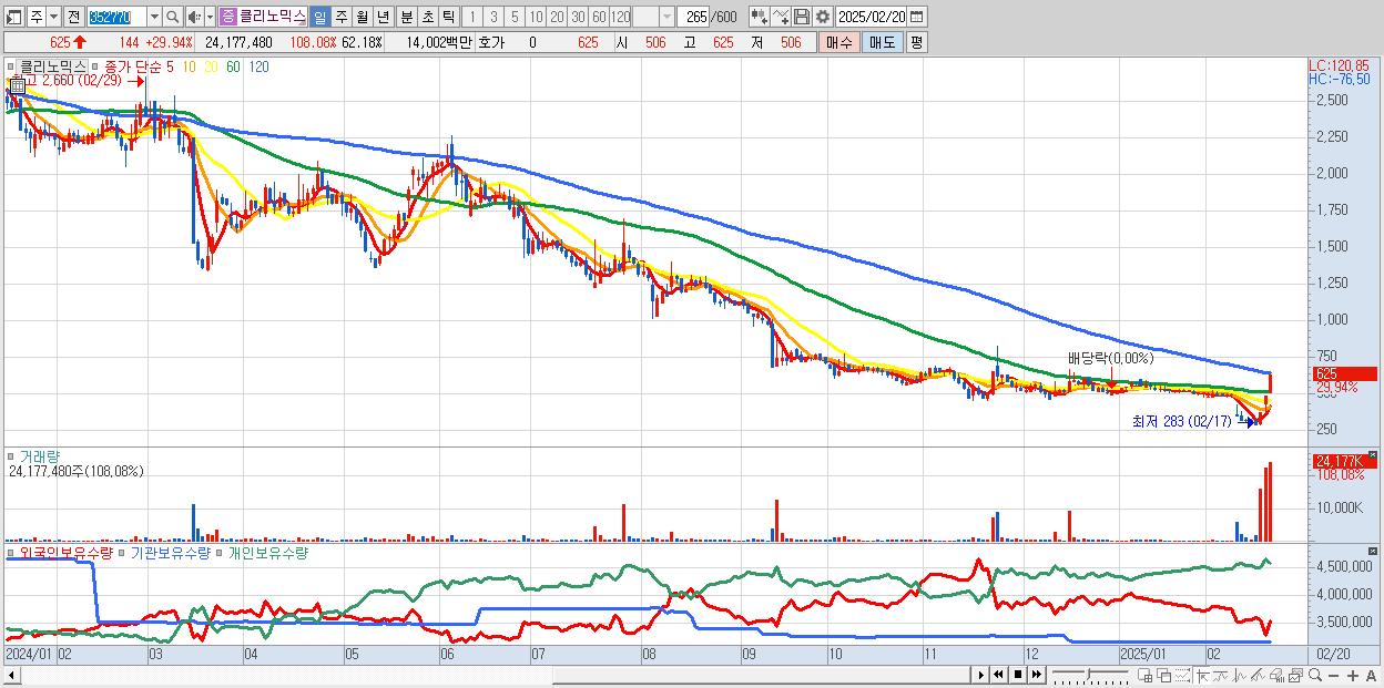 - 클리노믹스 (625원 ▲ 29.94% , 시총: 243억, 거래량: 24,177,480, 거래대금:140억)