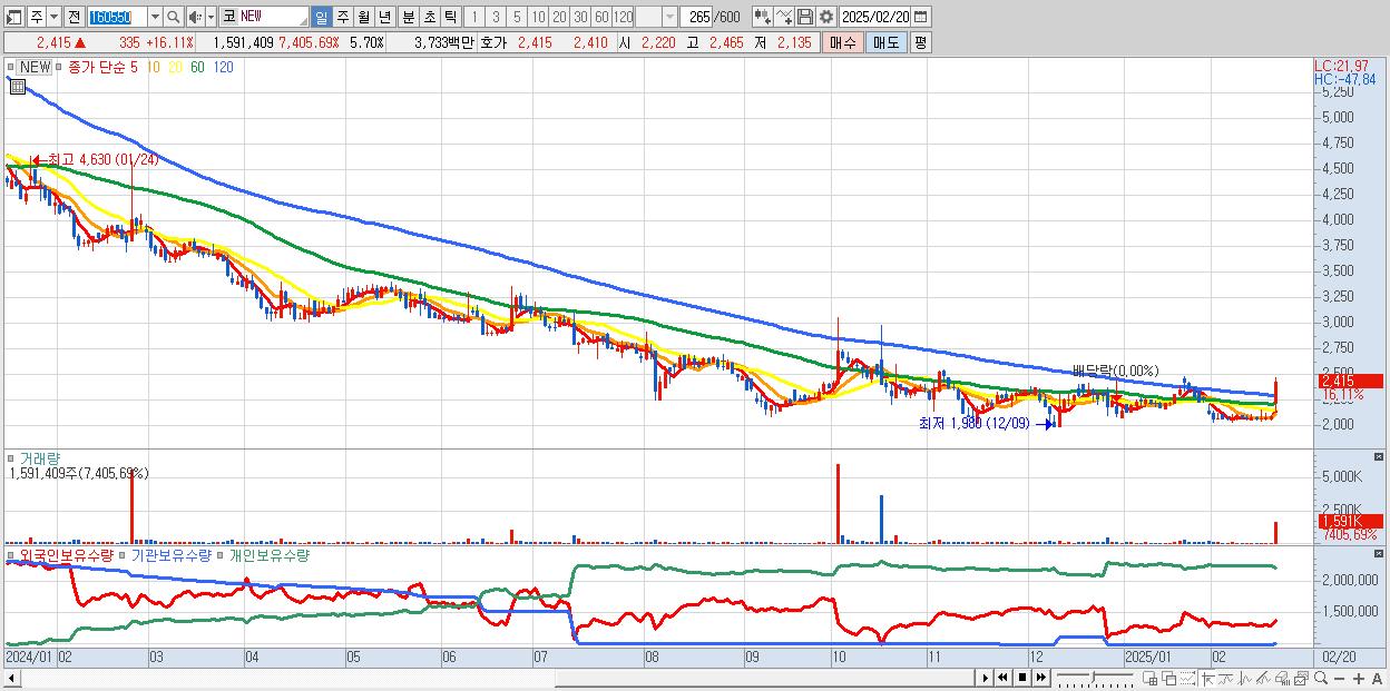 - NEW (2,415원 ▲ 16.11% , 시총: 674억, 거래량: 1,591,409, 거래대금:37억)