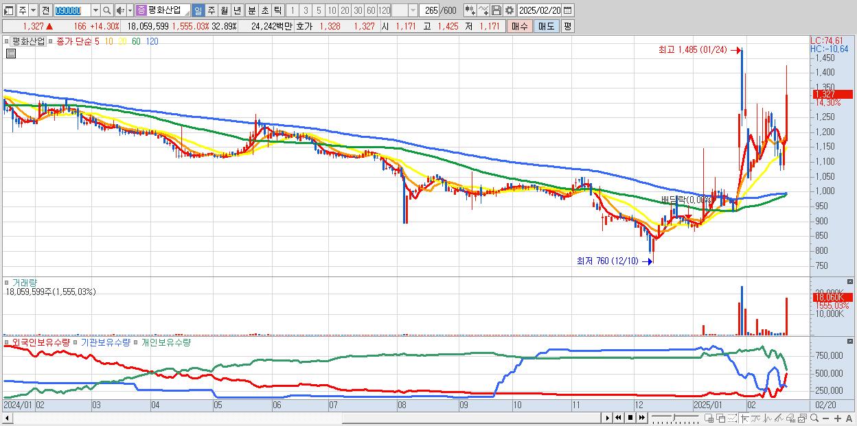 - 평화산업 (1,327원 ▲ 14.3% , 시총: 729억, 거래량: 18,059,599, 거래대금:242억)