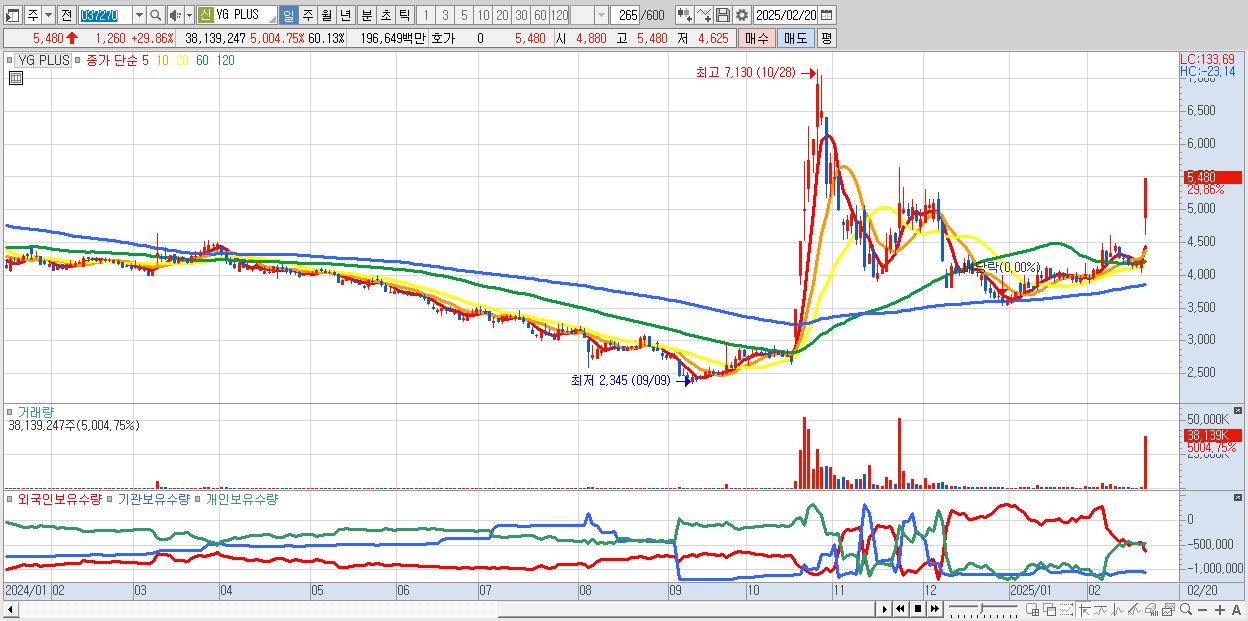 - YG PLUS (5,480원 ▲ 29.86% , 시총: 3,476억, 거래량: 38,139,247, 거래대금:1,966억)