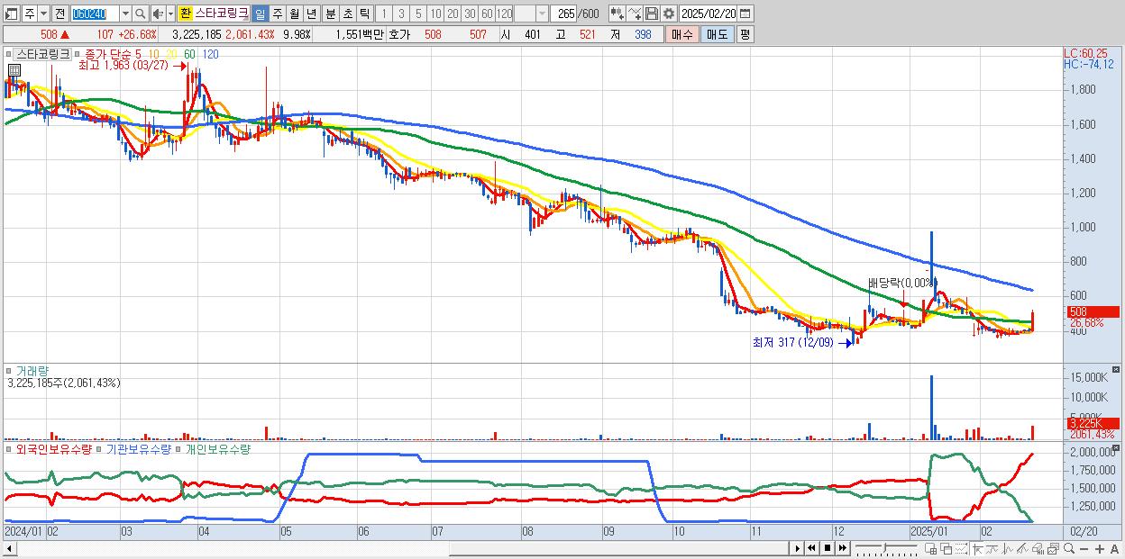 - 스타코링크 (508원 ▲ 26.68% , 시총: 164억, 거래량: 3,225,185, 거래대금:16억)