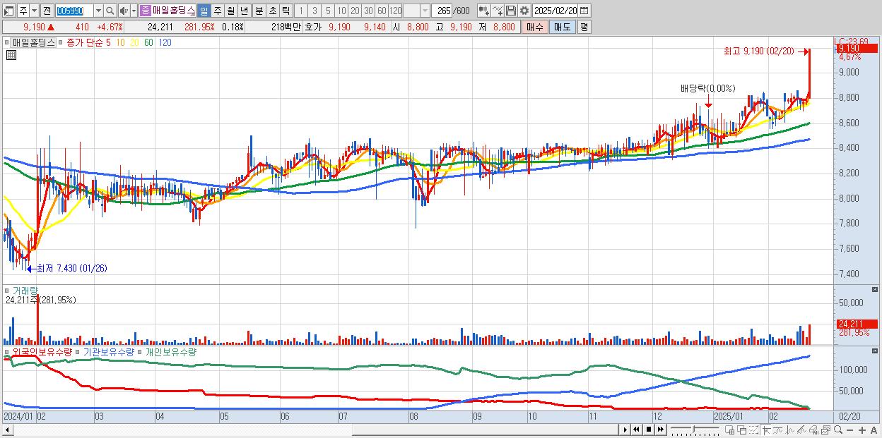 - 매일홀딩스 (9,190원 ▲ 4.67% , 시총: 1,261억, 거래량: 24,211, 거래대금:2억, KOSDAQ)