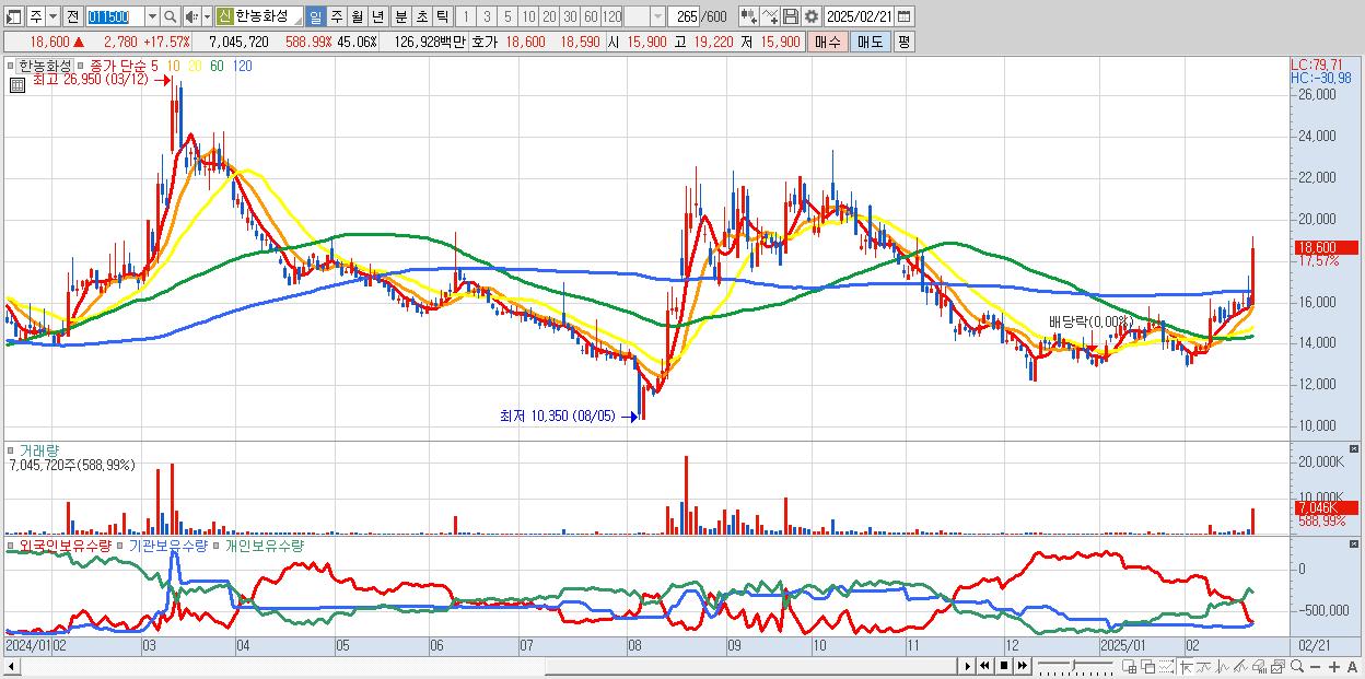 - 한농화성 (18,600원 ▲ 17.57% , 시총: 2,908억, 거래량: 7,045,720, 거래대금:1,269억)