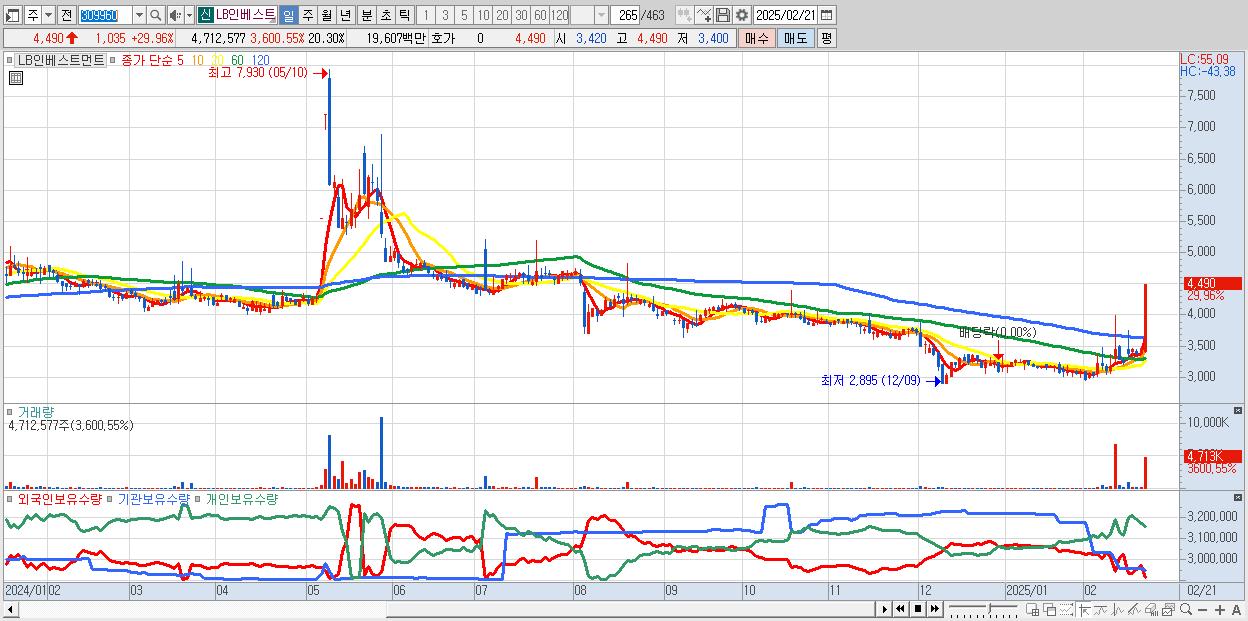 - LB인베스트먼트 (4,490원 ▲ 29.96% , 시총: 1,042억, 거래량: 4,712,577, 거래대금:196억)