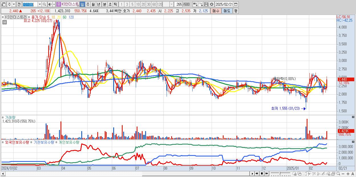 - KS인더스트리 (2,440원 ▲ 12.18% , 시총: 748억, 거래량: 1,423,310, 거래대금:34억)