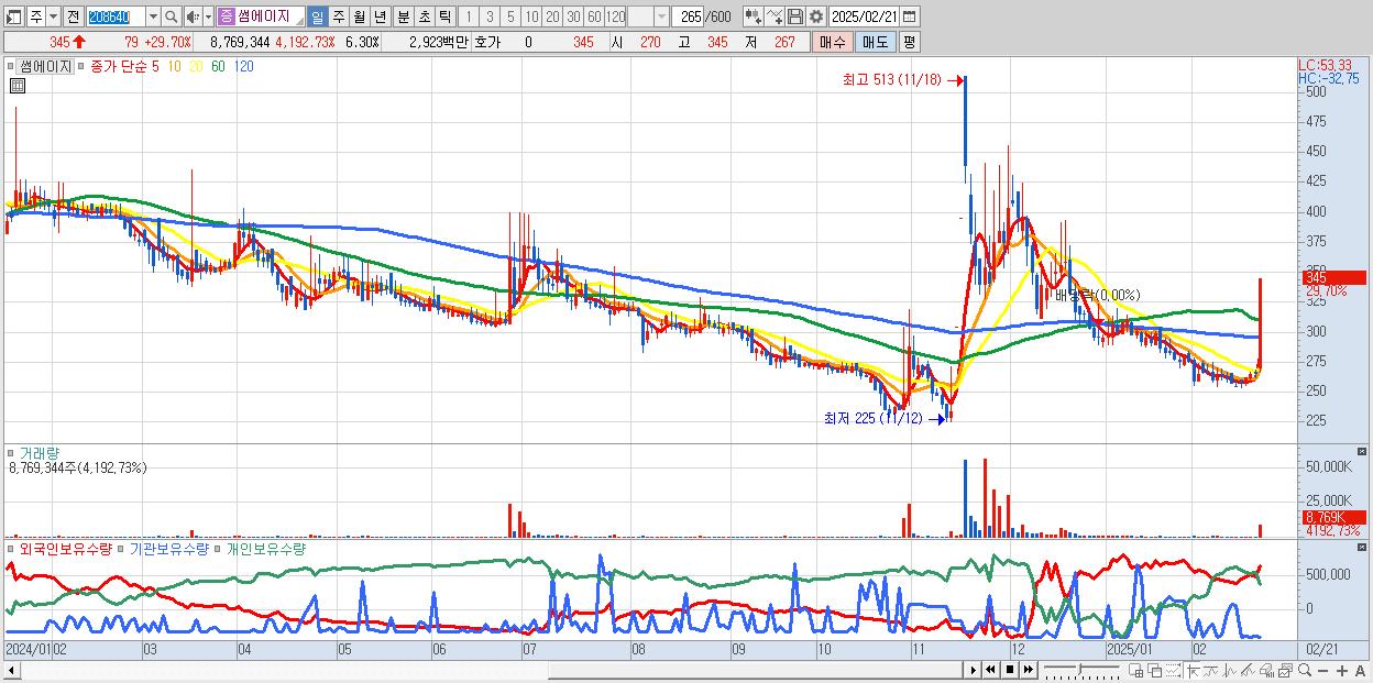 - 썸에이지 (345원 ▲ 29.7% , 시총: 480억, 거래량: 8,769,344, 거래대금:29억)