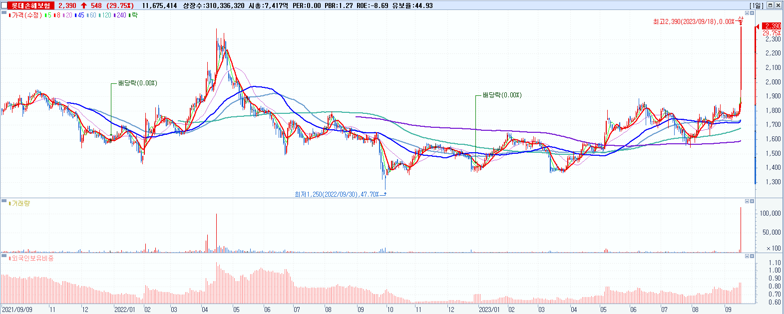 롯데손해보험 2,390원 ▲ 29.75% (KOSPI, 000400)