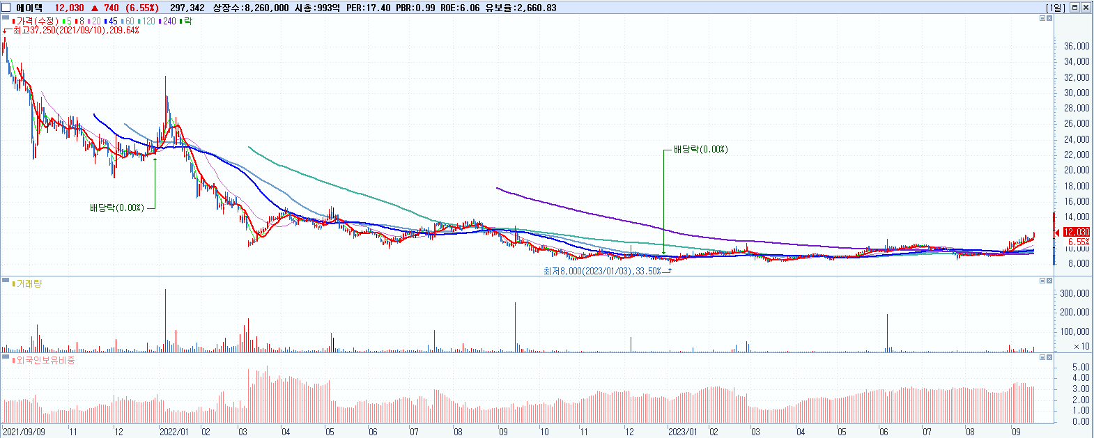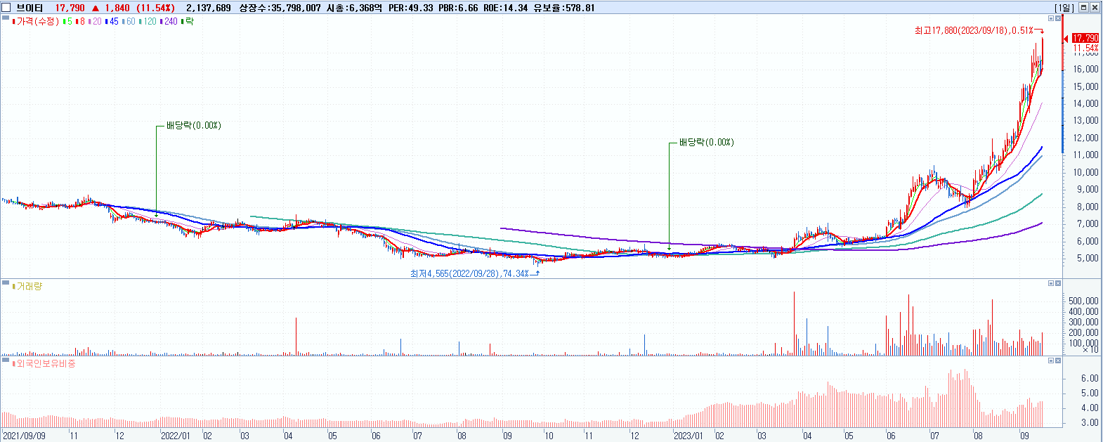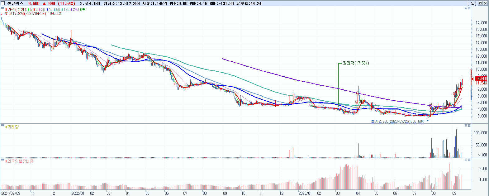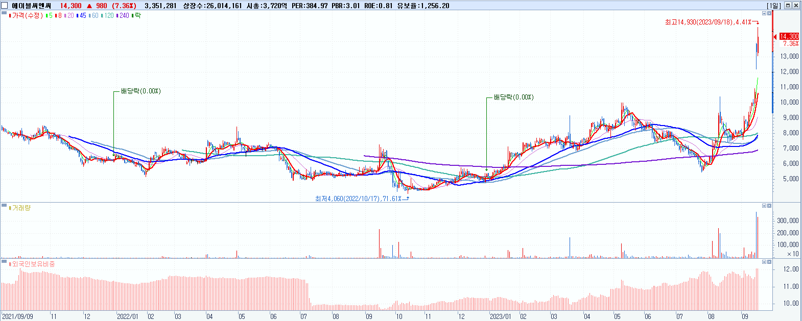 시총: 7,417억 거래량: 11,677,160 거래대금:264억