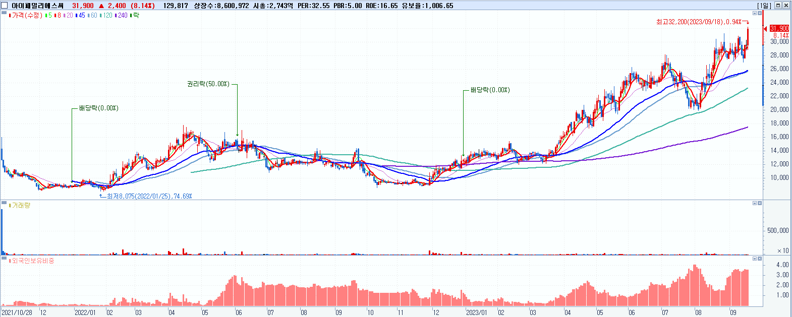 - 아이패밀리에스씨 (31,900원 ▲ 8.14% , 시총: 2,744억, 거래량: 129,917, 거래대금:40억, KOSDAQ)