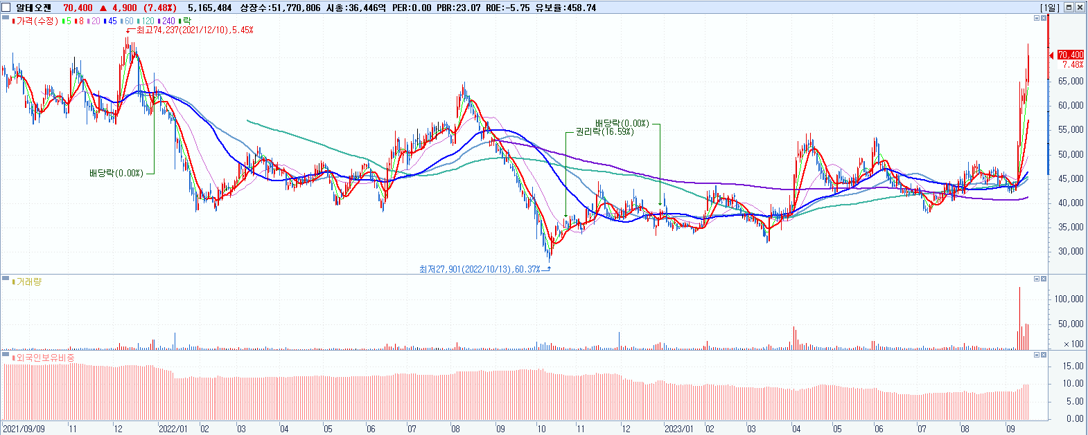 - 알테오젠 (70,400원 ▲ 7.48% , 시총: 36,447억, 거래량: 5,177,983, 거래대금:3,586억, KOSDAQ)