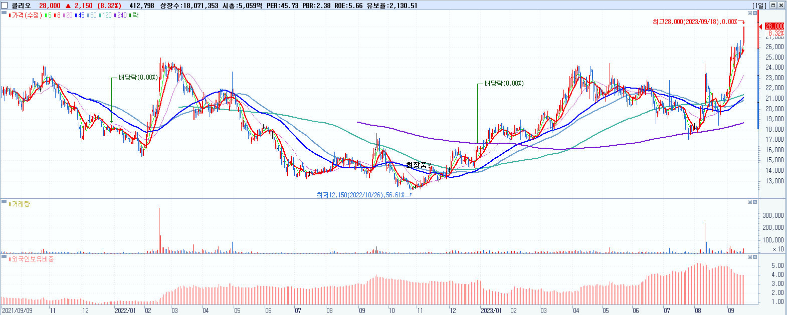 - 클리오 (28,000원 ▲ 8.32% , 시총: 5,060억, 거래량: 414,373, 거래대금:113억, KOSDAQ)