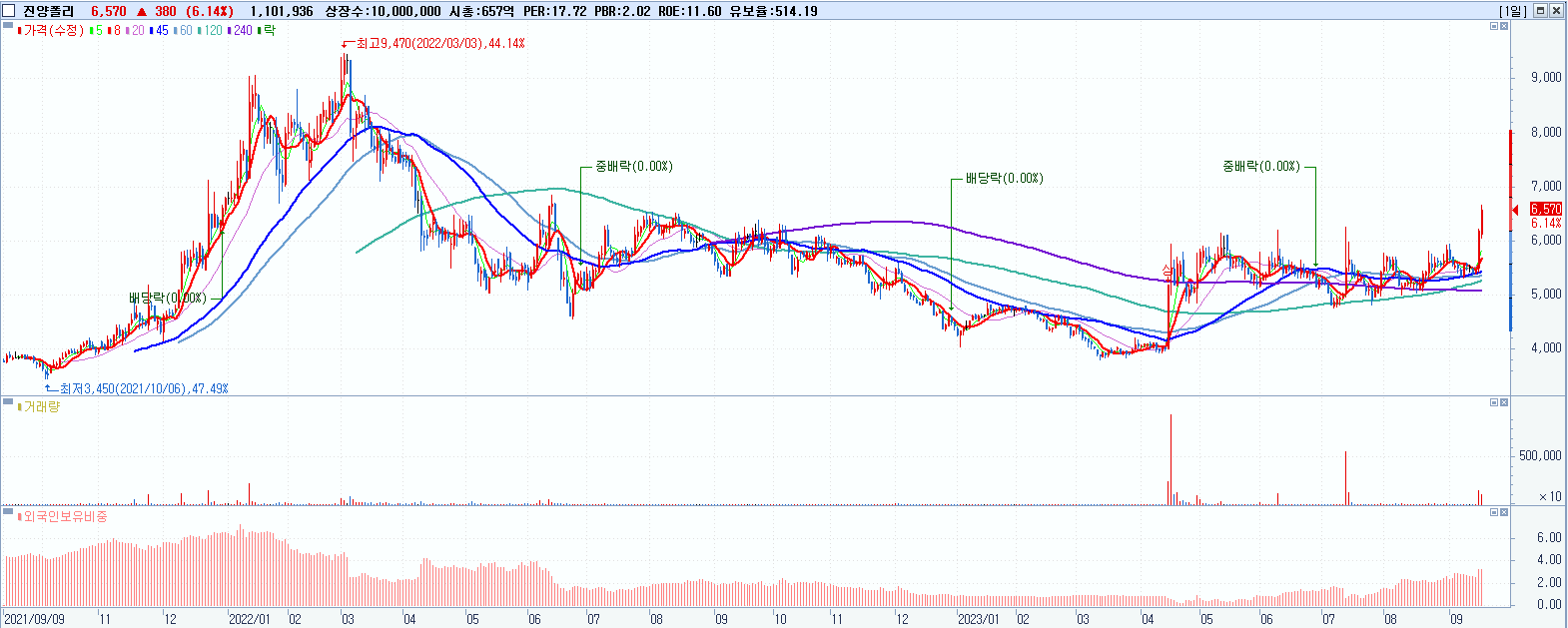 시총: 6,368억 거래량: 2,145,638 거래대금:365억