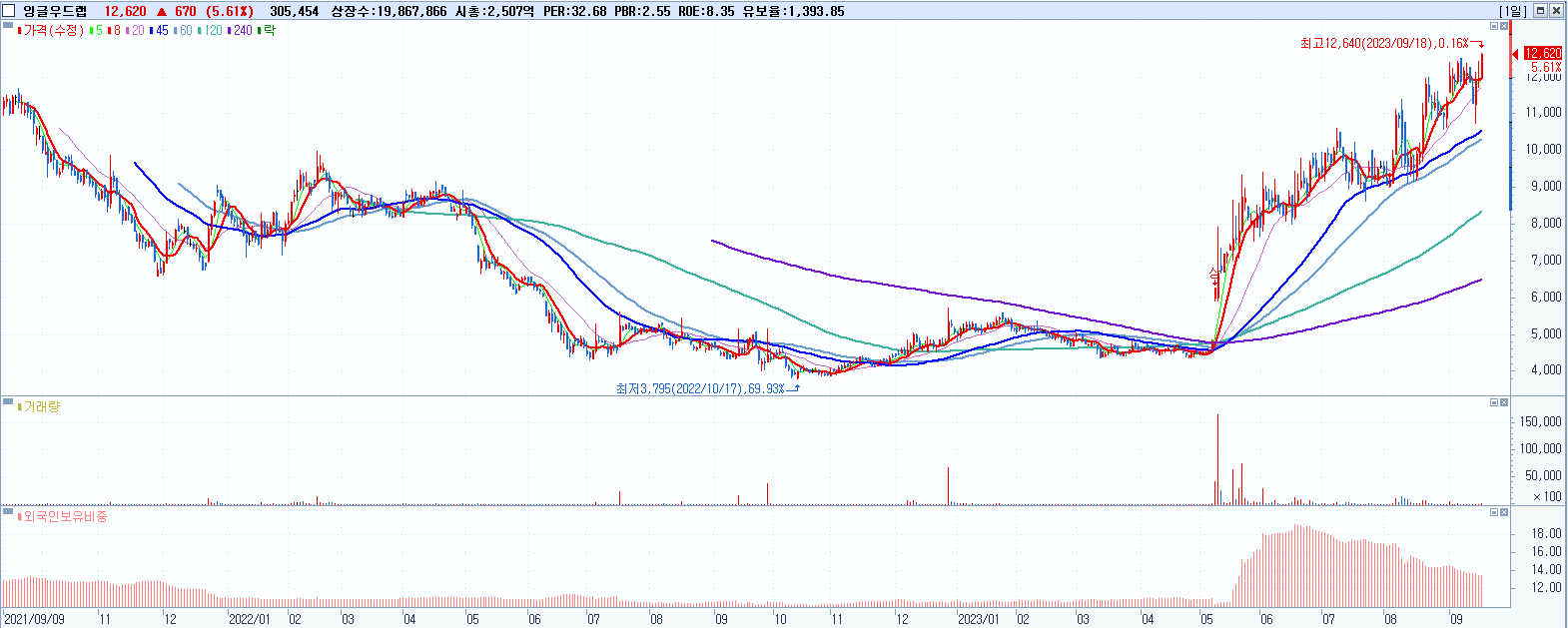 - 잉글우드랩 (12,620원 ▲ 5.61% , 시총: 2,507억, 거래량: 306,043, 거래대금:38억, KOSDAQ)