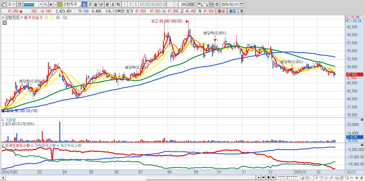 - 신한지주 (47,650원 ▲ 0.74% , 시총: 239,892억, 외국인 순매수 거래금:105억)