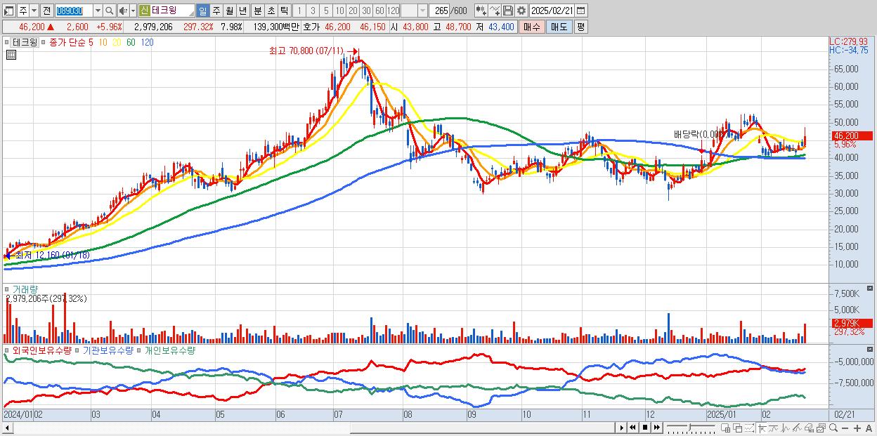 - 테크윙 (46,200원 ▲ 5.96% , 시총: 17,257억, 외국인 순매수 거래금:69억)