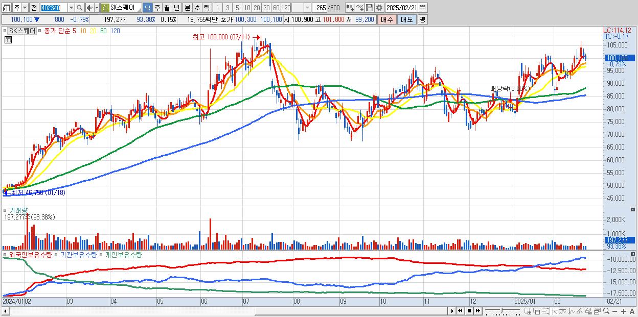 - SK스퀘어 (100,100원 ▼ -0.79% , 시총: 133,682억, 외국인 순매수 거래금:49억)