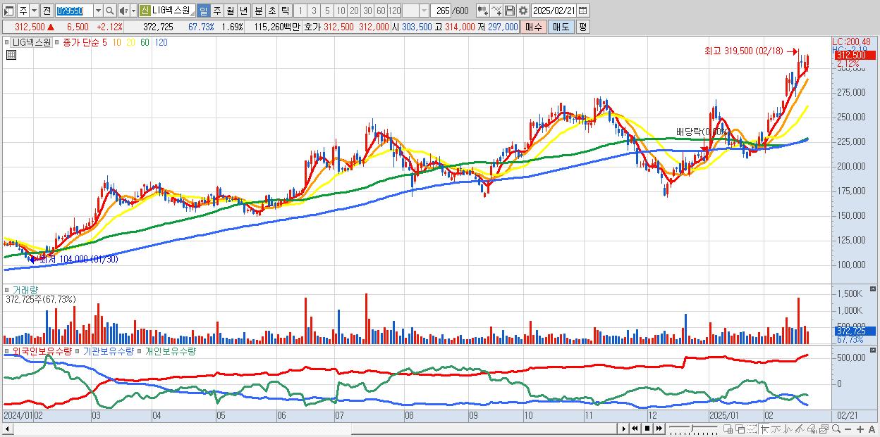 - LIG넥스원 (312,500원 ▲ 2.12% , 시총: 68,750억, 외국인 순매수 거래금:185억)