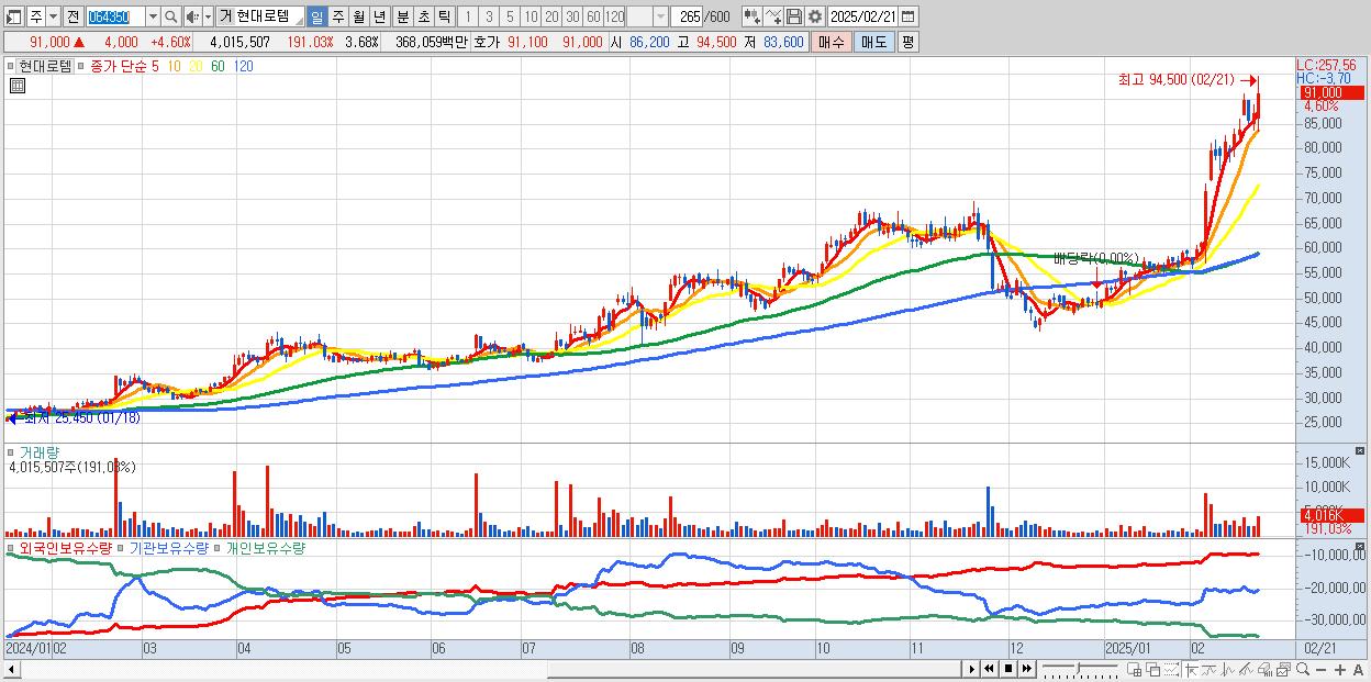 - 현대로템 (91,000원 ▲ 4.6% , 시총: 99,319억, 외국인 순매수 거래금:130억)