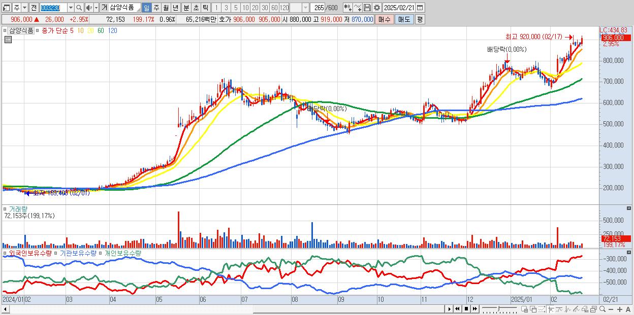 - 삼양식품 (906,000원 ▲ 2.95% , 시총: 68,249억, 외국인 순매수 거래금:80억)