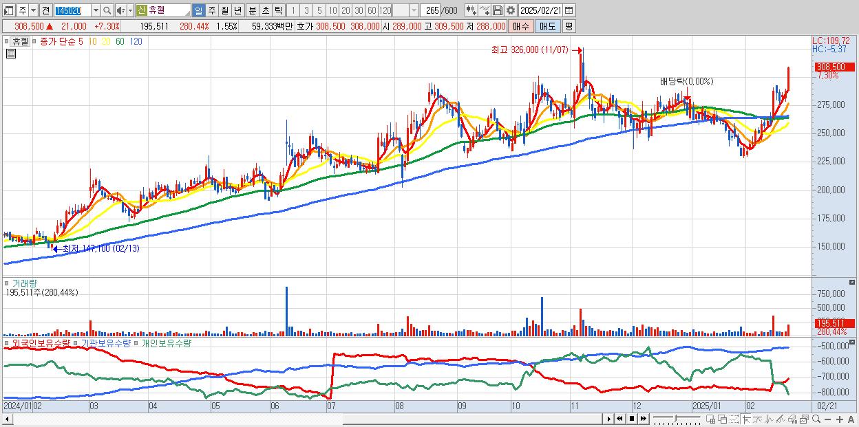 - 휴젤 (308,500원 ▲ 7.3% , 시총: 38,883억, 외국인 순매수 거래금:157억)
