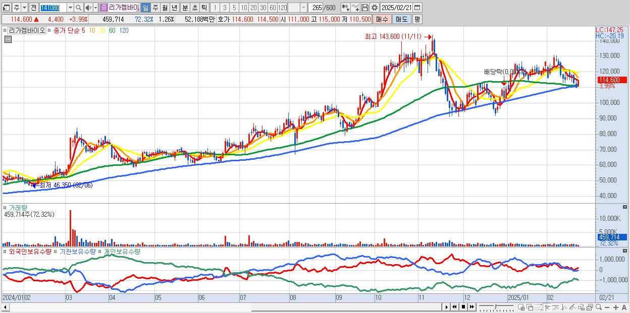 - 리가켐바이오 (114,600원 ▲ 3.99% , 시총: 41,955억, 외국인 순매수 거래금:89억)