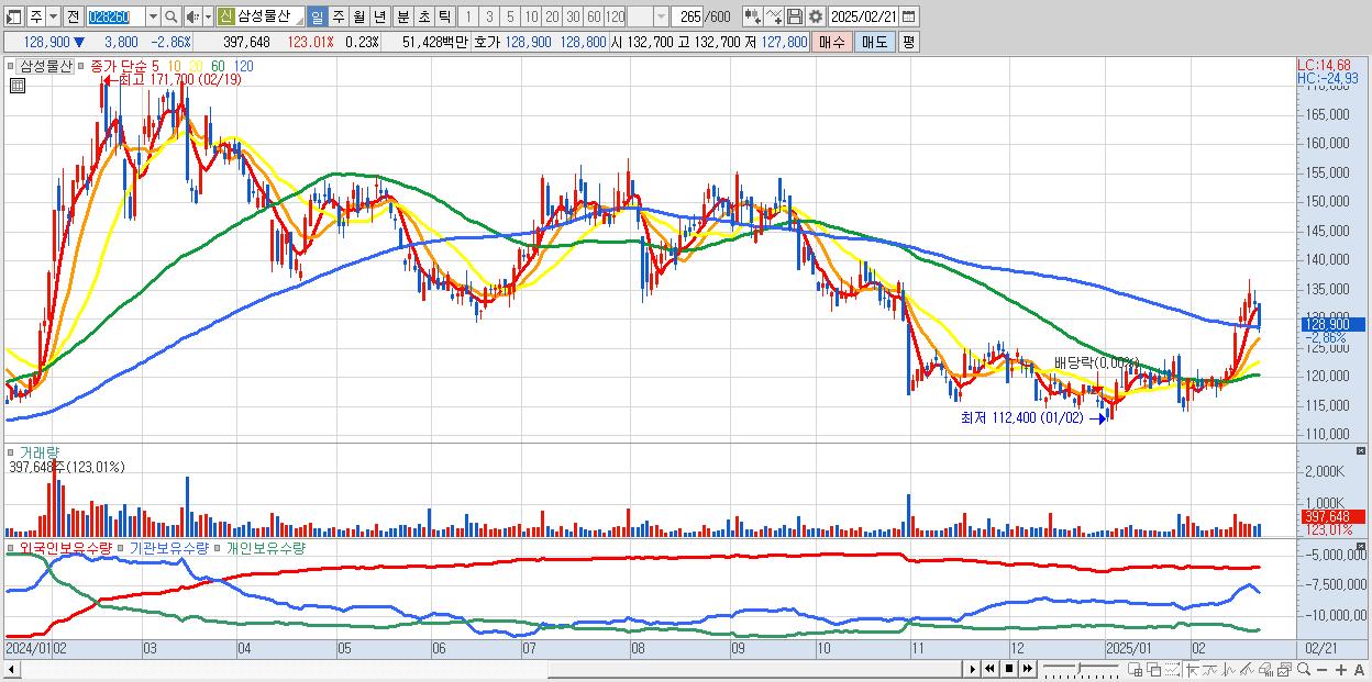 - 삼성물산 (128,900원 ▼ -2.86% , 시총: 219,100억, 외국인 순매수 거래금:110억)