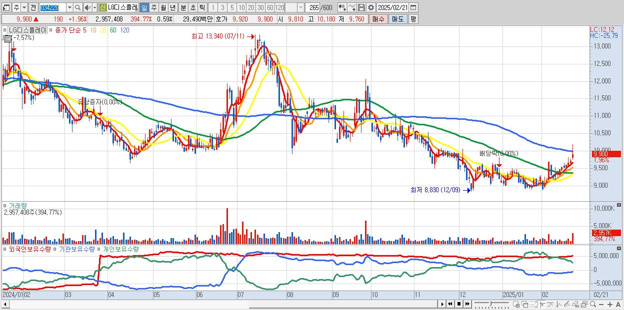 - LG디스플레이 (9,900원 ▲ 1.96% , 시총: 49,500억, 외국인 순매수 거래금:66억)