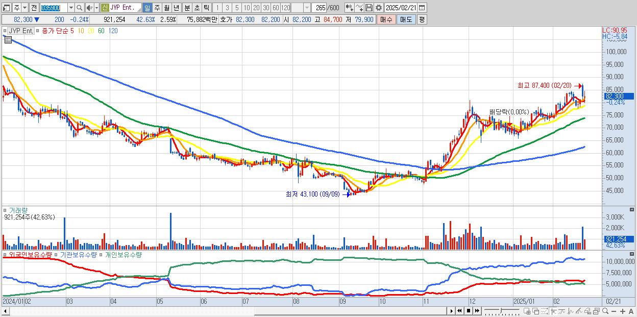 - JYP Ent. (82,300원 ▼ -0.24% , 시총: 29,243억, 외국인 순매수 거래금:119억)